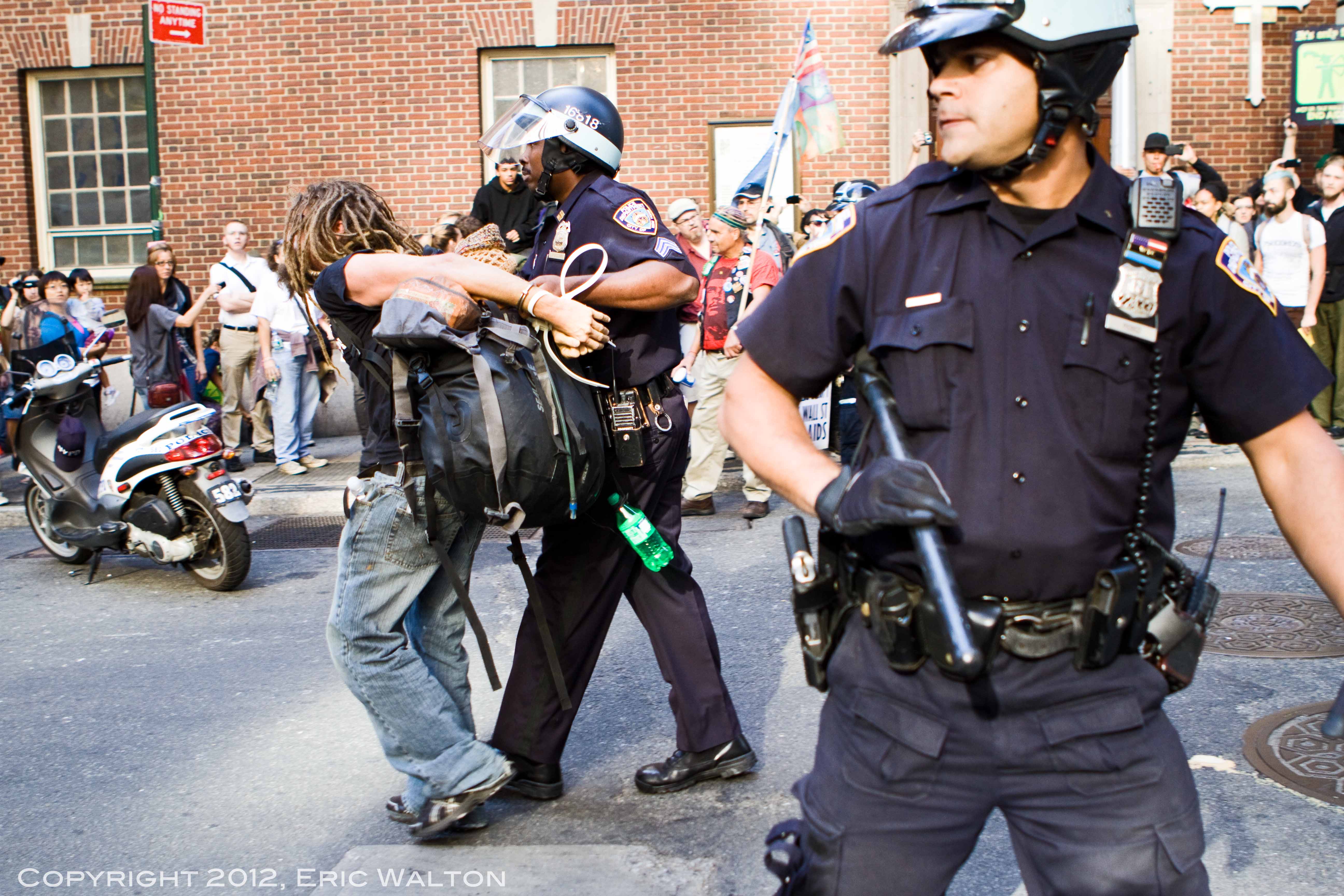 At around 1:00 a.m., dozens of police officers began to converge on the north side of the park and at about 1:30, many of them entered it with riot-cuffs, batons, and helmets and began to make arrests. Two police officers forced a young Hispanic man against a tree and as he was being hand-cuffed he shouted, “Can you tell me why I’m being arrested?! What am I being charged with?” As he was led to a police van, many protesters asked him his name. He yelled in response, “Angel Rodriguez!” In total, sixty-eight people were arrested.