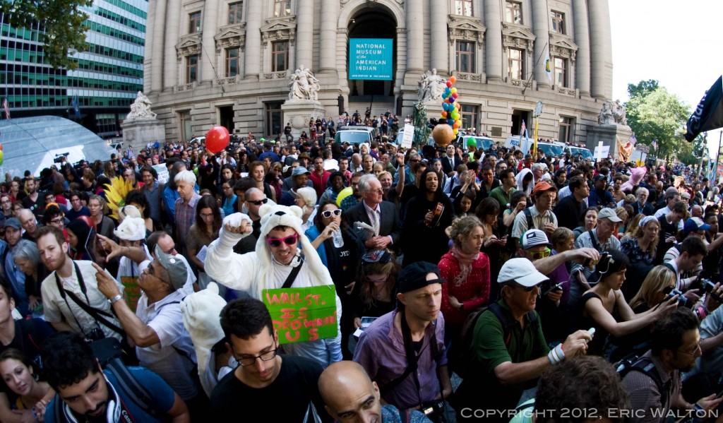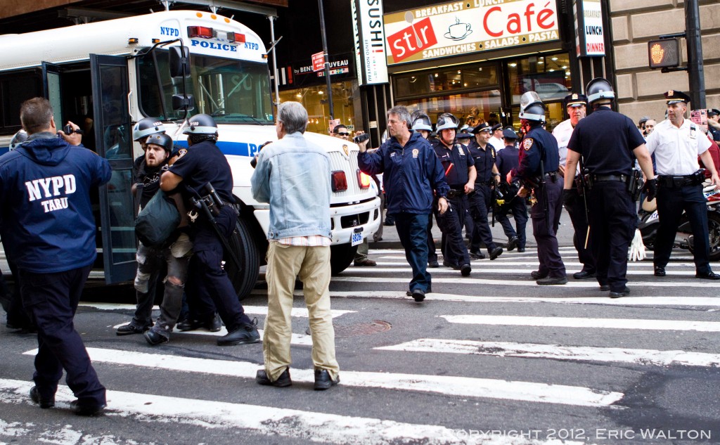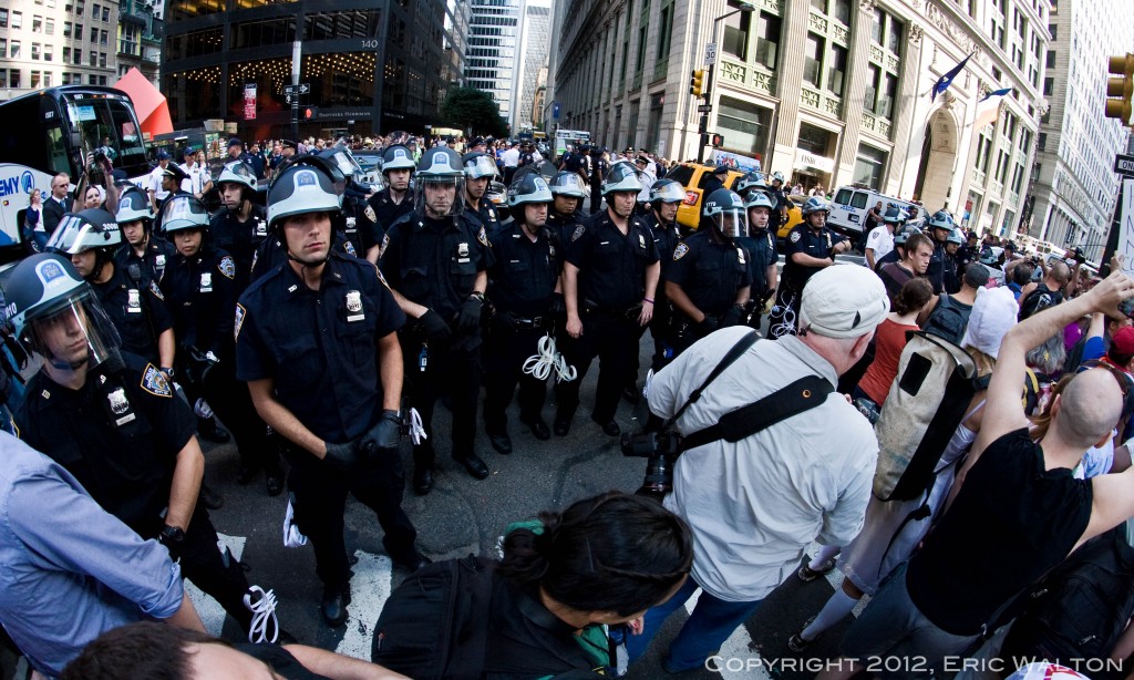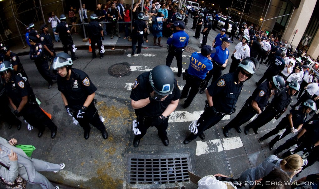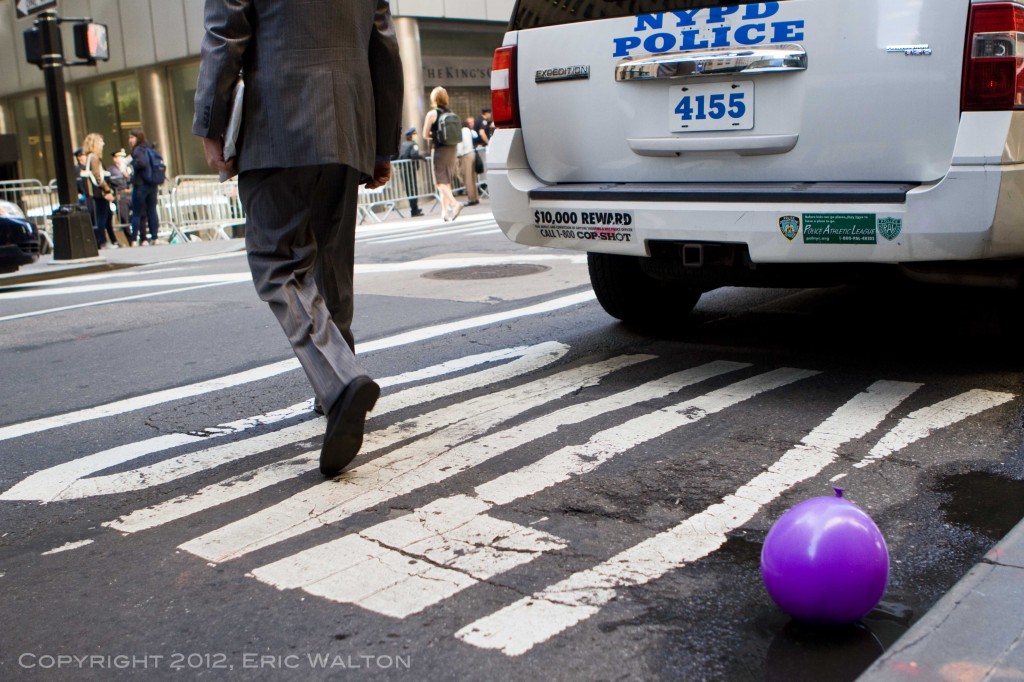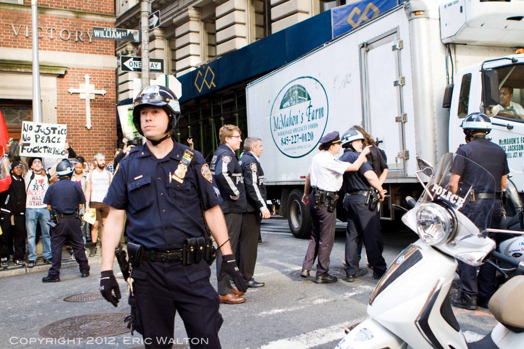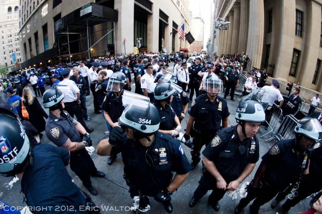 S17: Occupy Wall Street Turns One by Eric Walton 9.22.12 http://darlinghouse.net/beta/darlingfitzroy/2012/09/21/s17-occupy-wall-street-turns-one/ http://darlinghouse.net/beta/darlingfitzroy/2012/09/21/s17-occupy-wall-street-turns-one/#comments Fri, 21 Sep 2012 06:13:42 +0000 fitzroy http://darlinghouse.net/beta/darlingfitzroy/?p=148 September 17th, 2012 marked the one-year anniversary of Occupy Wall Street. I arrived in Manhattan’s Financial District at around 7:30 that morning to find that Wall Street had been rendered unoccupiable by the NYPD. Hundreds of New York’s Finest were stationed behind steel barricades that blocked the streets leading to Wall Street and The New York Stock Exchange, while hundreds more officers, some on foot, some on mopeds, and some in riot gear, stood sentinel at strategic points around the perimeter of the Golden Fortress.